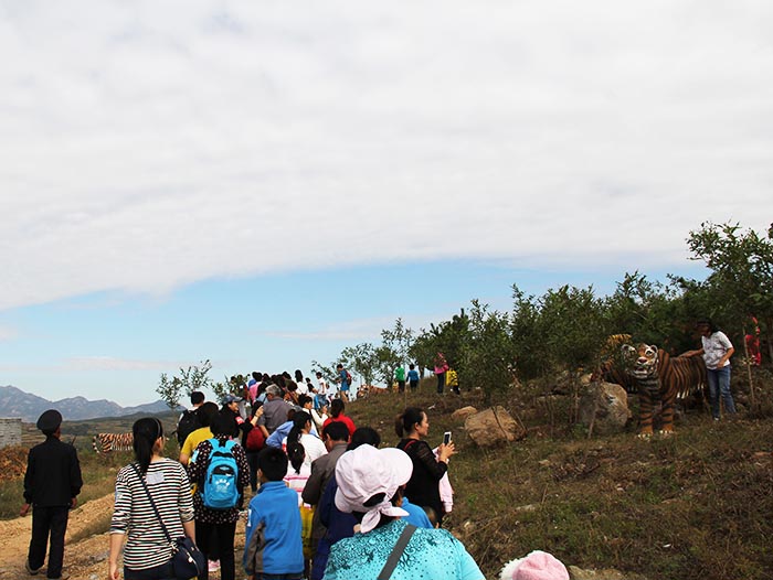 开园仪式结束后,游客们纷纷前往百虎园,观赏百虎奇观。睡虎山共建包含白虎在内的106只形态各异、栩栩如生的大小老虎造型。其中虎王长12米、高4.8米、宽3.6米,炯炯有神地卧于该园正门,极其显眼。