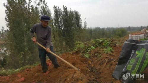 10月20日上午,邱前村的韩百生大爷正在自己的地里刨地瓜。别看韩大爷82岁高龄,干起活来劲头很足,二分地一上午的功夫就刨完并将地瓜收入篮中。可就在几个月前栽种地瓜时,由于舍不得买柴油泵和水管,韩大爷还是用担子一担一担将水浇进地瓜田。“当时早晨吃了饭就来干活,秧地瓜、挑水从白天干到天黑,柴油泵花费太高了,我们哪舍得用。”
