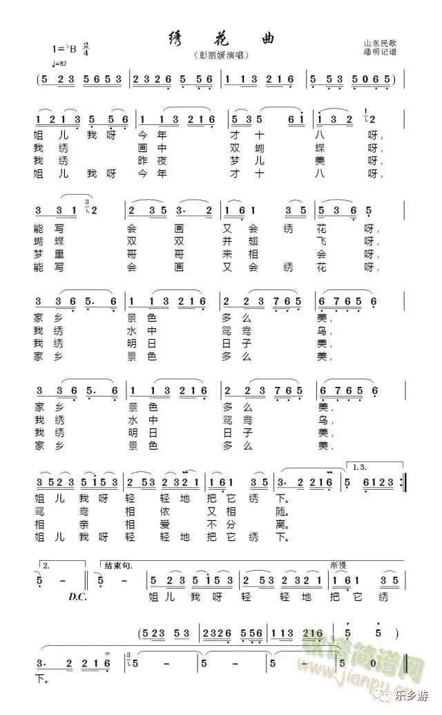 《绣花曲》 曲谱采用1957年秋五莲县文化馆部分工作人员协同青岛海军基地政治部文工队挖掘记录的五莲民歌《十二个月》,有音乐老师石歌(原名石恩典)编曲创作的。