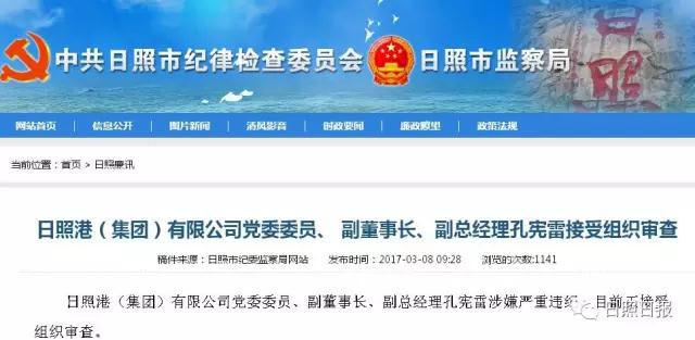 1、日照港高层又有一人接受组织审查 3月8日,日照市纪委监察局网站发布消息:日照港(集团)有限公司党委委员、副董事长、副总经理孔宪雷涉嫌严重违纪,目前正接受组织审查。 2016年12月29日,日照市纪委监察局网站发布消息:日照市人民政府国有资产监督管理委员会党委书记杜传志涉嫌严重违纪,目前正接受组织调查。 目前,日照港管理层已有两人被审查。