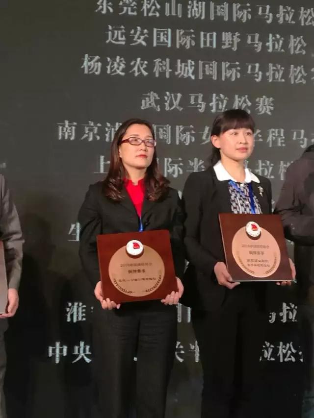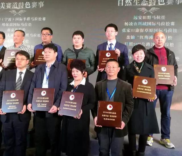 日照市政府办公室副主任孙运国,日照市体育局党组书记、局长孟凡香分别上台领取了2016中国马拉松自然生态特色赛事和2016中国田径协会铜牌赛事荣誉称号。