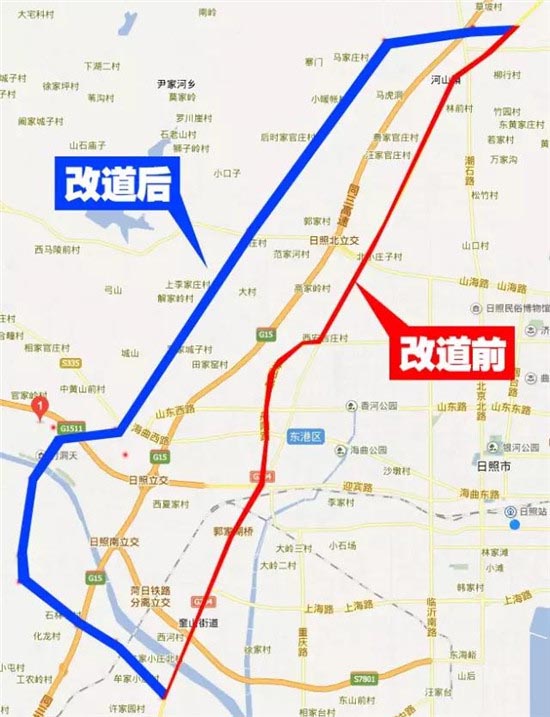 向西在邱家官庄村东北下穿沈海高速,于窦家官庄村东南下穿在建青连铁路后转向南,在贾家庄村西北上跨山海西路,于大古城村北上跨S313、小长汪崖村东上跨日兰高速、马家岭村东北跨傅疃河,在河北岭村东南上跨机场路,于东曲河村东南与S220 交叉后跨曲河,在石林村东北下穿沈海高速,于合庄村东下穿在建青连铁路和兖石铁路,在牟家小庄村东南接G204 到达终点。