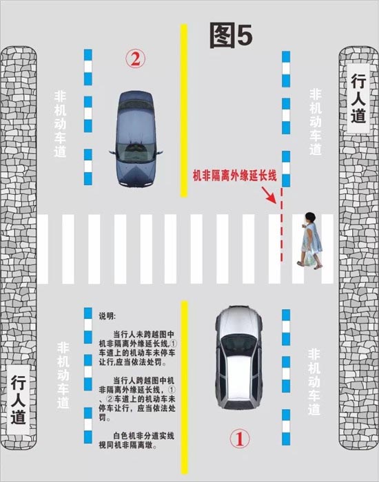六张图片中的行人都是已经进入人行横道行走的,相邻车道的机动车应当停车让行,符合法律规定。就是说如果在机动车行驶的方向前,行人已经进入人行横道准备通过的,相邻车道的机动车要停车礼让,机动车驾驶员可以用闪灯或招手提醒行人先走,行人已通过人行横道的机动车可以通行。