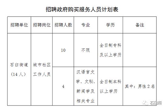根据工作需要,石臼街道特委托日照嘉轩人力资源有限公司(以下简称嘉轩公司)为街道社区招聘政府购买服务人员14名,现就有关招聘事项公告如下: