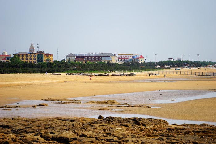 第四海水浴场就在任家台礁石的旁边,很奇怪这里独特的地貌,沙滩和礁石泾渭分明,从礁石遍布的地方只要走几步,就可以来到平整干净一望无际的沙滩。第四海水浴场在森林公园外面都是免费的部分,沙滩平整,沙子特别细腻,第三海水浴场人气最旺,但是那里的沙子可没有这里细腻。