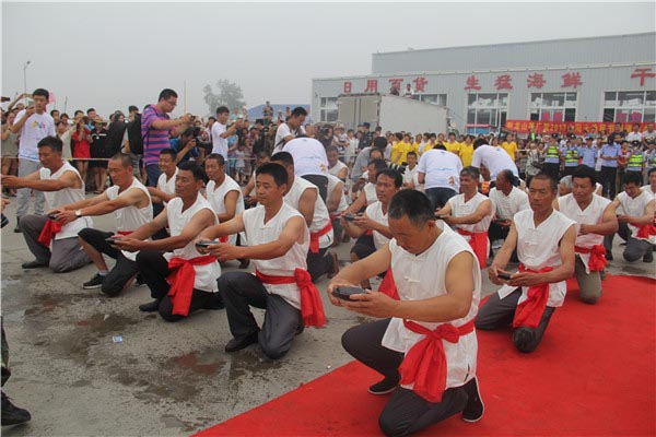 “一敬酒:感恩海洋;二敬酒:波平浪静;三敬酒:鱼虾满仓。”60名渔家汉子手捧斟满酒的大海碗,面向广阔的大海,高声喊诵。30位渔姑渔嫂三叩首为渔民兄弟祈愿:出入平安、一帆风顺、满载而归。