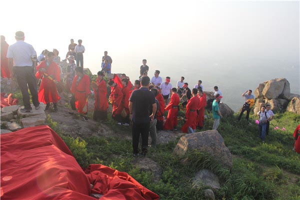 早上6:38分,祀日大典在山清水秀、灵气自生的人间仙境—天台山主峰正式开始,此次祀日大典分敬献贡品、燔柴祈日、敬上信香、宣读祭文、顶礼膜拜、祀日乐舞等9个环节,大典由市太阳文化旅游度假区管委会办公室副主任、涛雒镇党委书记厉华珍同志主持,市太阳文化旅游度假区管委会副主任、山东海洋文化旅游发展有限公司董事长、总经理赵东江同志作了开场致辞,市旅发委主任、市太阳文化旅游度假区管委会副主任王均波同志宣读祀日祭文,全体宾客与典仪人员一起行“太阳礼”,集体祈福。