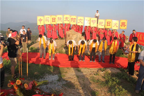 7月12日上午,由市旅发委、海洋文旅公司、涛雒镇政府、市太阳文化研究会联合举办的2017中国•日照太阳文化节暨祀日大典在天台山举办。日照市市委、统战部部长、市太阳文化旅游度假区管委会主任杨留星,市旅发委主任、市太阳文化旅游度假区管委会副主任王均波,市太阳文化旅游度假区管委会副主任、山东海洋文旅公司党委书记董事长总经理赵东江,市旅发委副主任赵志超等领导出席开幕式。太阳文化旅游研究专家学者代表,市有关企业、金融机构、媒体、旅游协会组织负责人,涛雒镇部分村党支部书记和人民群众等300余人齐聚天台山,为太阳祝寿祈福。