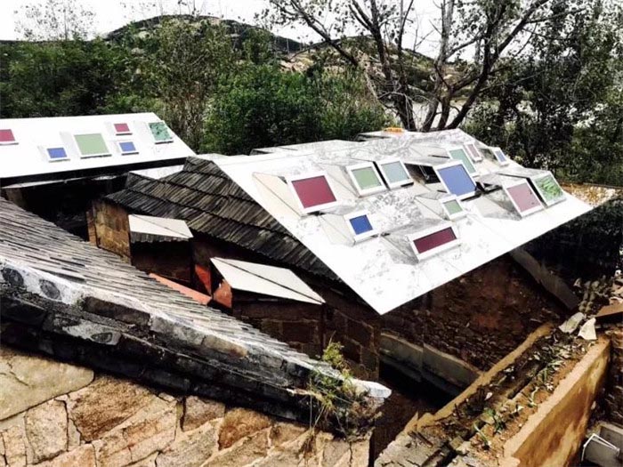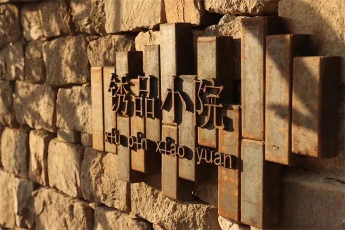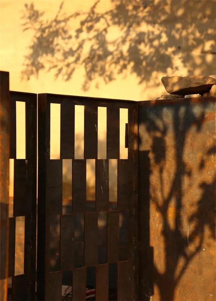 阳光下的锈品小院,是一种特别厚朴的红锈色,城市里的水泥钢筋,让人有一种疏离感,而锈品小院在初始,也是钢本身的银白,经雨水冲刷,阳光曝晒,山村的风日夜抚摸出的这一身锈迹,却让人感觉到一种亲近,这一切都是自然而言的,与自然关联,与内心关联。