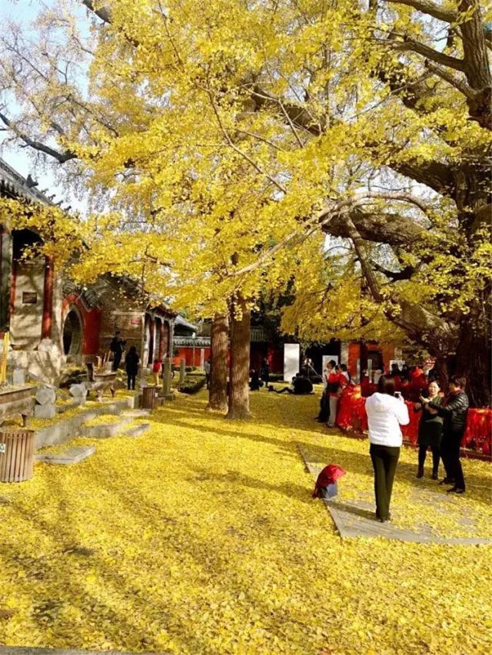 (这两张从下往上拍的照片很明显能看出来,银杏树的树冠部分变黄了,但是底部的还是绿色的居多。)