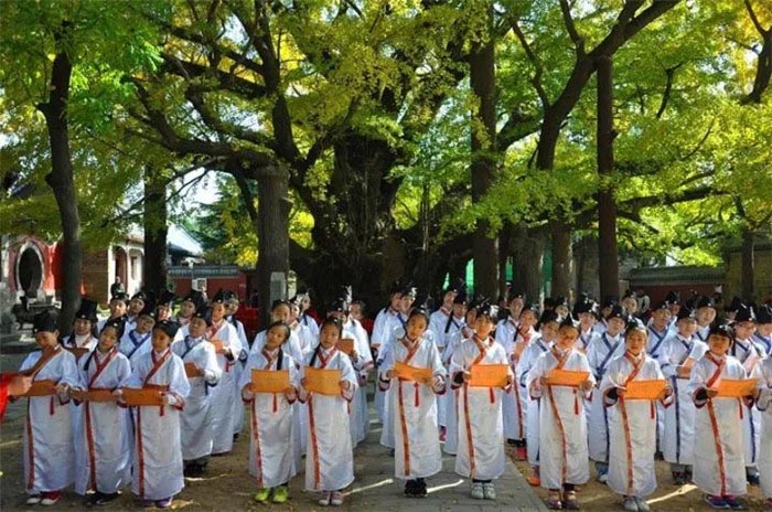 11月4日上午10点,在浮来山风景区举办莒县首届银杏节开幕式,书童打扮的小学生们朗朗诵读国学经典,展现莒文化传承至今的风貌。