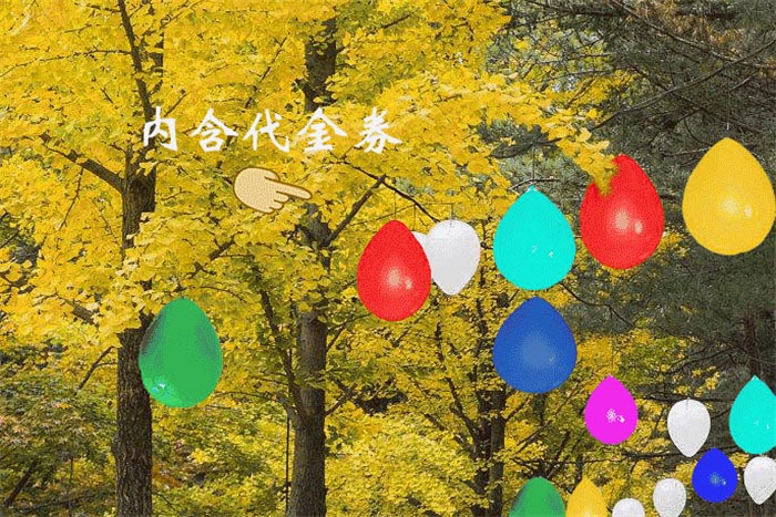 色彩缤纷的气球藏着一张张代金券(代金券用途暂时保密)悬挂于银杏树上,供游客摘取、挤爆欢乐。