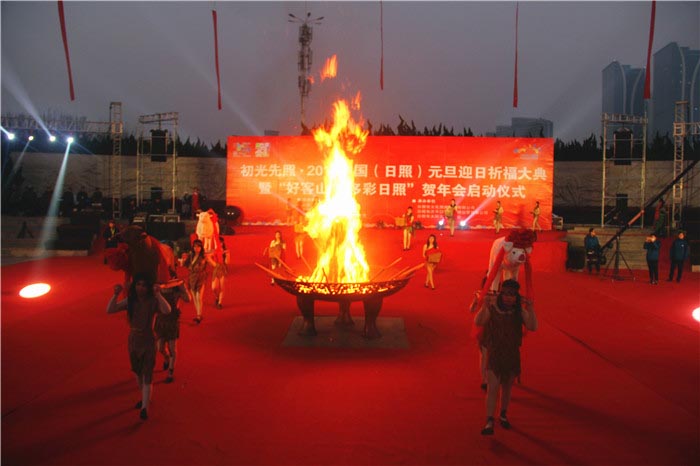 早上6:15,欢快的歌声唤醒沉睡的大地,精彩的表演拉开黎明的序曲;按照日照本地民间流传的“燔柴祀日”远古习俗,摆上三牲祭品,重现远古祭拜太阳的场景;太阳升起的时刻,撞响“太阳圣钟”,伴随着悠扬的钟声,数万人一起面向太阳,感恩太阳,祈福未来,许下对新年的美好愿望,随即精彩绚丽的飞伞表演引起人群的欢呼,现场达到高潮。