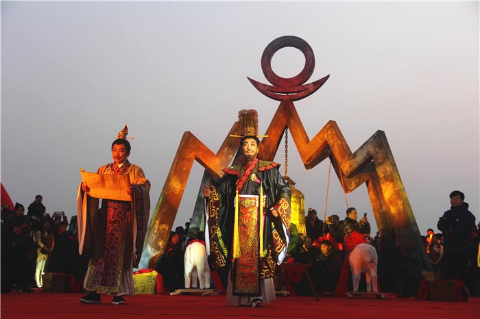 二是古风汉韵与现代元素交织,一脉相承的太阳崇拜贯穿始终。燔柴乐舞环节,伴随着由500个号角吹奏出的乐曲,巫师带领人们载歌载舞,迎接太阳的升起;祭天祀日环节,皇帝带领文武百官在祭坛前颂读祭文、拜日祈福,重现古代的人们太阳崇拜的场景;圣钟祈福环节,将时空拉回现代,敲响太阳圣钟,现场观众共同感恩太阳,祈祷国泰民安;时空交错中体现出自远古到现代一脉相承的太阳崇拜。