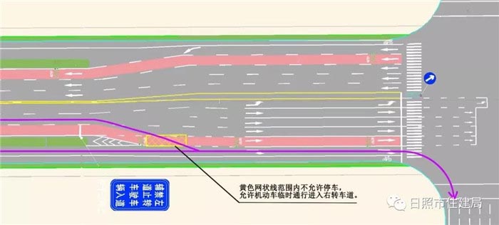 1.右转可借行。在公交专用道启用的时间内禁止非公共汽车驶入,需在路口右转弯的其他机动车,可在路口按照交通标志标线借公交专用道右转,如下图所示。