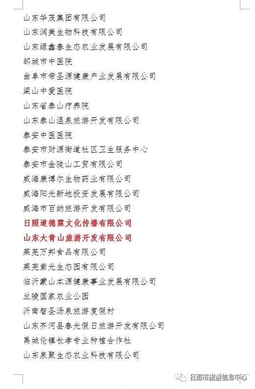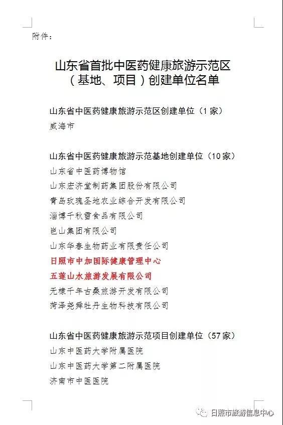 重磅好消息!重磅好消息 近日,山东省旅游发展委员会 山东省中医药管理局 发布关于山东省首批中医药健康旅游示范区(基地、项目)创建单位名单公示的通知 日照多家单位入选,看看有你们单位吗 日照市中加国际健康管理中心—健康管理运动 五莲山大佛 大青山国际太极拳大赛 日照道德霖文化传播有限公司—食疗养生