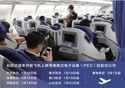 目前,已宣布开放飞机上使用便携式电子设备(PED)的航空公司有7家:东方航空、海南航空、祥鹏航空1月18日起,南方航空、厦门航空1月19日起,山东航空1月22日起,春秋航空2月1日起。