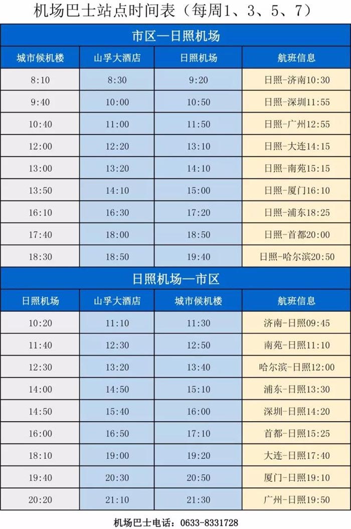 春节期间特价机票! ↓↓↓ 年前特价机票看这里↓ 春节期间特价机票看这里↓ 日照→哈尔滨 720元 日照→济南 150元 日照→天津 202元 日照→大连 240元 日照→长沙 422元 日照→上海 260元 日照→西安 402元 日照→广州 775元 日照→北京 333元 日照→杭州 355元 日照→成都 760元 日照→沈阳 445元 日照→深圳 365元 日照→太原 514元 日照→厦门 800元 好啦~还在犹豫什么呢! 赶紧带着家人、闺蜜、朋友 你与这个世界 不过一张机票的距离 附最新航班时刻表、机场巴士站点时刻表 注:具体航班时刻以航班实际运营为准,如航班变更,恕不另行通知,请广大旅客安排出行前查询。