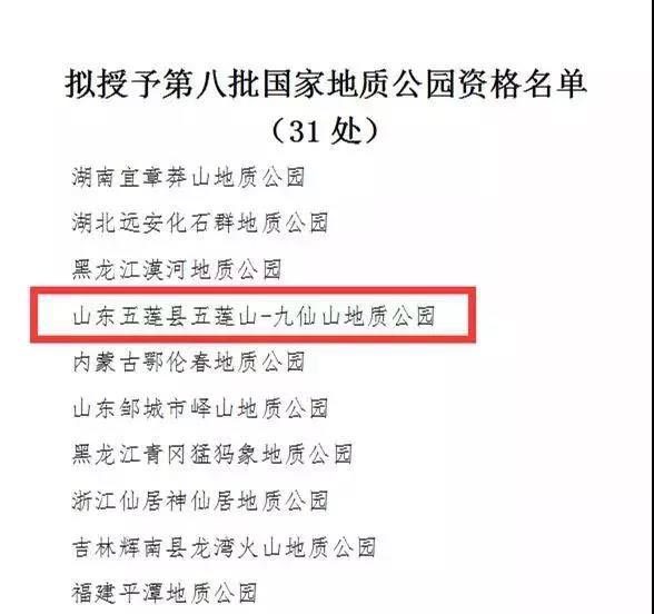 2018年2月2日,国土资源部发布公告,正式授予五莲山-九仙山地质公园国家地质公园资格。这是五莲山旅游度假区继荣获国家AAAA级旅游区、国家森林公园、中国生态旅游试验示范基地等称号后所获的又一殊荣。