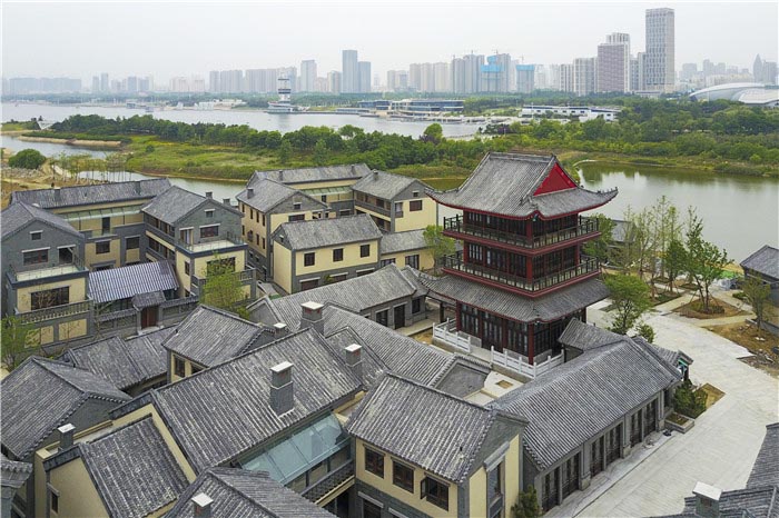 A岛道路两旁古色古香的海草房错落有致地连缀, B岛穿插书院、戏台、茶馆等历史人文元素,突出展示了明清仿古文化特色。通过设计单位参考日照的一些老的照片、老的文献,还原日照本地明清时的主要建筑,再通过施工单位邀请一些老师傅对原来的一些工艺进行还原,以保证达到最终效果。