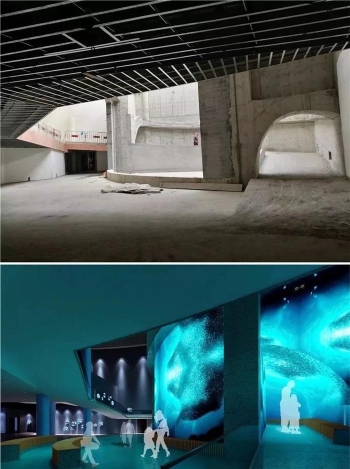 整个海洋公园的建设已经进入室内外装饰装修阶段。海洋馆外墙装饰即将完成,通过玻璃连廊与完成外部施工的四季花鸟园连接在一起。两个场馆内部各展池池体防水施工也基本完成,进入池内造景和亚克力玻璃安装阶段。