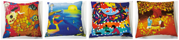 日照农民画绣以构图饱满、色彩艳丽,造型款张而著称。充满浓郁的乡土气息和人文情怀。以“农民、渔民”的时代生活为创作素材,在现实主义的浪漫情怀中,渗透日照历史文化,独具东方神韵的艺术风格,融入时代生活。已经设计生产出几十个系列200多款产品。