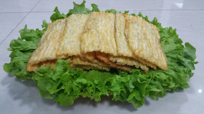 黄金烤鱼片,是当地海域出产的大马哈鱼经过十几道工序精致加工而成的,深受全国广大消费者喜爱,鱼片肉质蓬松,香甜可口。