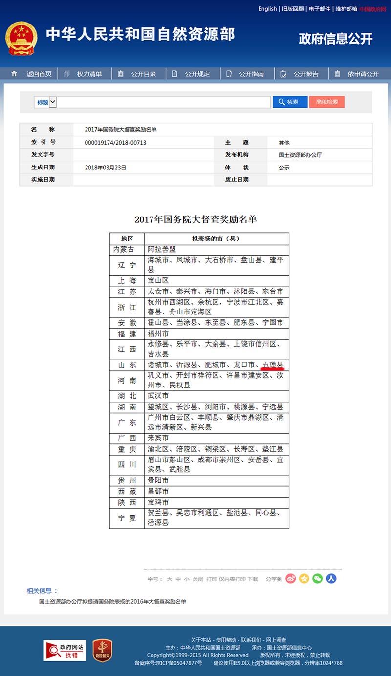 近日,2017年国务院大督查奖励名单公布,山东省5个县市榜上有名,我市五莲县入榜!