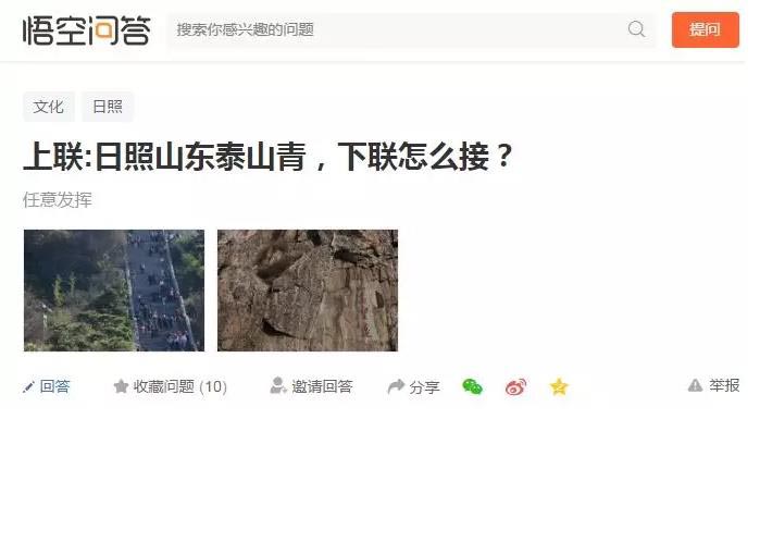 某日,小编浏览悟空问答,发现有人发了一个上联接下联的问题:上联:日照山东泰山青,下联怎么接?重点是,任意发挥!