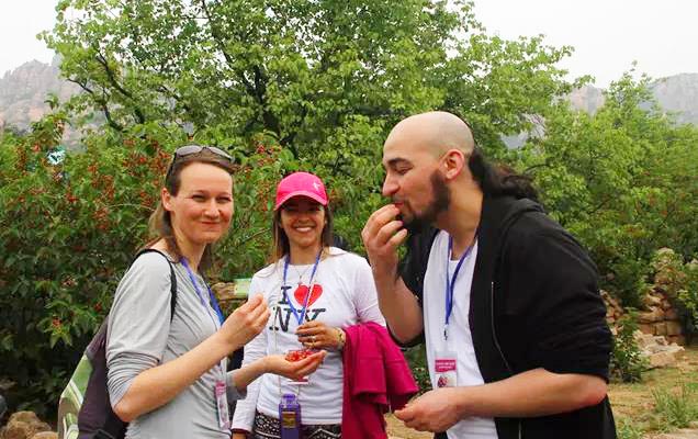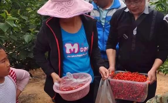 △来德国的lily与友人在五莲县叩官镇大旺村樱桃采摘园。