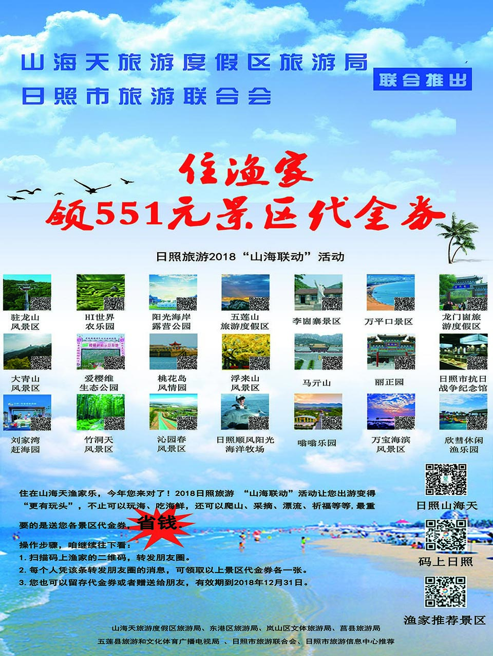 代金券面额可抵用一部分景区消费,包括门票、景区项目等,每人限用一张,让入住渔家的游客花更少的钱来日照旅游;代金券背面有三个二维码,每一个都是日照旅游的入口,游客扫码可了解景区详情、致电咨询、一键导航等多种功能,既方便又快捷。