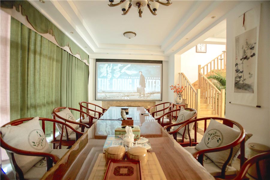 通透的落地窗,采光佳,客厅会议桌可容纳14人小型会议,高清投影仪,150寸超大屏幕,组合回音壁让您仿佛身处影院,亦可进行PPT演示、KTV演唱等。