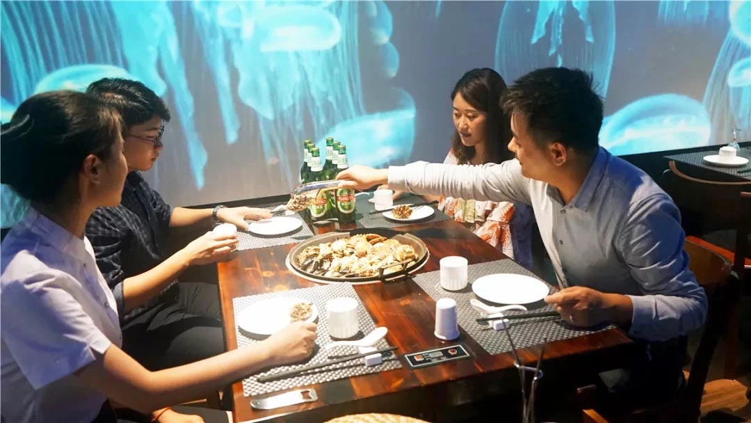 欢乐海洋3D美食餐区、海上嘉年华休闲美食聚会区、铁板烧海鲜料理区、威士忌酒吧,主要打造以海洋牧场海鲜为特色的餐饮+酒吧文化体验。