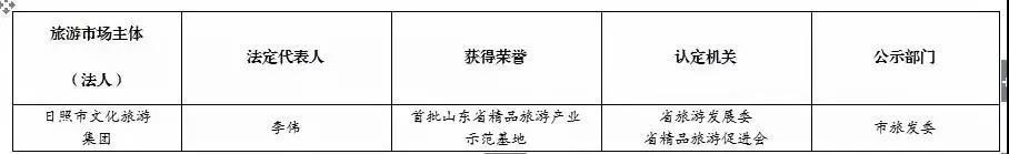 第三期旅游市场诚信“红黑榜”名单 红 榜(1个) 日照市文化旅游集团 法定代表人:李伟 获奖情况:首批山东省精品旅游产业示范基地 认定机关:省旅游发展委 省精品旅游促进会 公示部门:市旅发委
