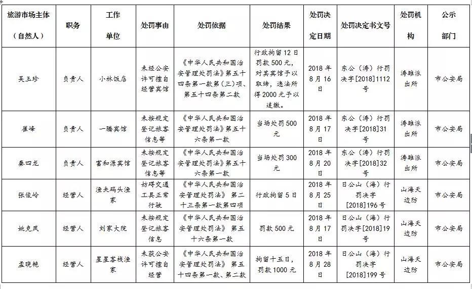什么是旅游市场“红黑榜”? 旅游市场“红黑榜”制度是以信用为核心,强化旅游市场事中事后监管机制,将诚实守信、守法经营的旅游市场列入“红榜”,将违反法律法规、不履行法定义务、违背诚信守诺原则、弄虚作假的旅游市场主体列入“黑榜”。 第三期旅游市场诚信“红黑榜”名单 红 榜(1个) 日照市文化旅游集团 法定代表人:李伟 获奖情况:首批山东省精品旅游产业示范基地 认定机关:省旅游发展委 省精品旅游促进会 公示部门:市旅发委 黑 榜(共10个) 自然人(10个):