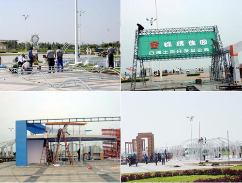 距离2003中国•日照房地产博览会开幕时间不足两天,整个万平口景区一片繁忙,各参展单位正在加班加点,昼夜不停,抓紧时间布置、装饰会场。 生态公园内,房博会开幕式现场展台正在搭建中,由主会场向南向北延展的房地产展区、综合展区、文化展区、汽车展区、广告展区五大展区,各参展单位的布展工作井然有序,展台搭建各具特色,别样风情,引得游人纷纷驻足观看。 国庆节与房博会同时到来,日照人民双喜临门,万平口洋溢在一片祥和喜庆的气氛中。