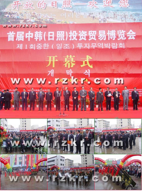 2003年10月11日上午9:30分,2003首届中韩(日照)投资贸易博览会开幕式在海滨商贸中心广场举行。开幕式由博览会常务副主任、日照市副市长侯成君主持,日照市市长于建成、山东省外经贸厅副厅长梁波、韩国驻青岛总领馆总领事朴钟先分别致辞。日照市市委书记李兆前及市领导邵长福、孙运河、李敏、王爱东等为开幕式剪彩。市直各部门、各区县负责人、中外参展、参会企业负责人、新闻媒体及各界群众共10000余人参加了开幕式。