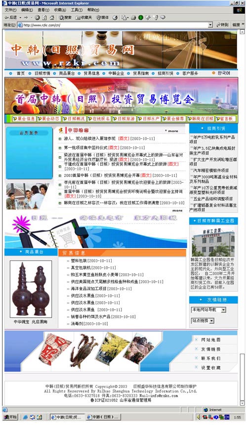首届中韩(日照)投资贸易博览会开幕前夕,中韩(日照)贸易网开通。 《中韩(日照)贸易网》(http://www.rzkr.com http://www.rizhaokorea.com)将为首届中韩(日照)投资贸易博览会指定网上宣传、现场网上直播媒体。 据了解,《中韩(日照)贸易网》是“数字化日照”的重要组成部分,由日照市信息产业办公室联合日照盛华科技信息有限公司开办的,《中韩(日照)贸易网》是我市首家全面介绍日照市与韩国经济互动的专业网站。网站以中文、韩文两种语言进行宣传。