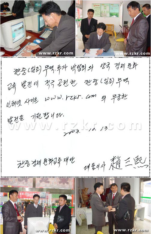 随后,赵三熙先生欣然提笔,写下了“祝愿,为韩中(日照)贸易投资博览会和两国经济文化交流做出积极贡献的韩中(日照)贸易网www.rzkr.com无穷发展”的题辞,并与网站工作人员合影留念。