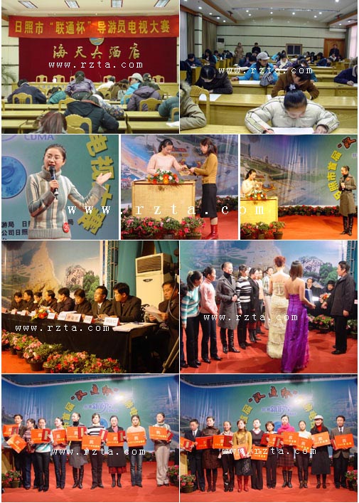 本次大赛分初赛和决赛。初赛分导游知识理论笔试,现场模拟导游,个人才艺表演三项内容,通过初赛选拔出前30名导游员参加决赛。决赛分现场模拟导游,抽签问答和个人才艺展示三项内容。为使大赛达到公开、公平、公正的要求,特邀请日照职业技术学院的教授,日照电视台,中国联通公司日照分公司及市旅游局的领导作为本次大赛的评委,并将每位选手的得分情况当场亮分公布。经过友好激烈的角逐,评选出10名“名星导游员”和“10名优秀导游员”。日照春秋旅行社、日照金秋旅行社和莒州旅行社荣获优秀组织奖。