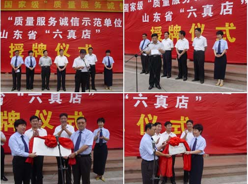 本报讯 9月12日, 在友谊商店隆重举行国家级“质量服务诚信示范单位”“山东省六真店”授牌仪式。日照市旅游局副局长孙元庆进行了讲话,市贸易办领导进行了重要讲话。