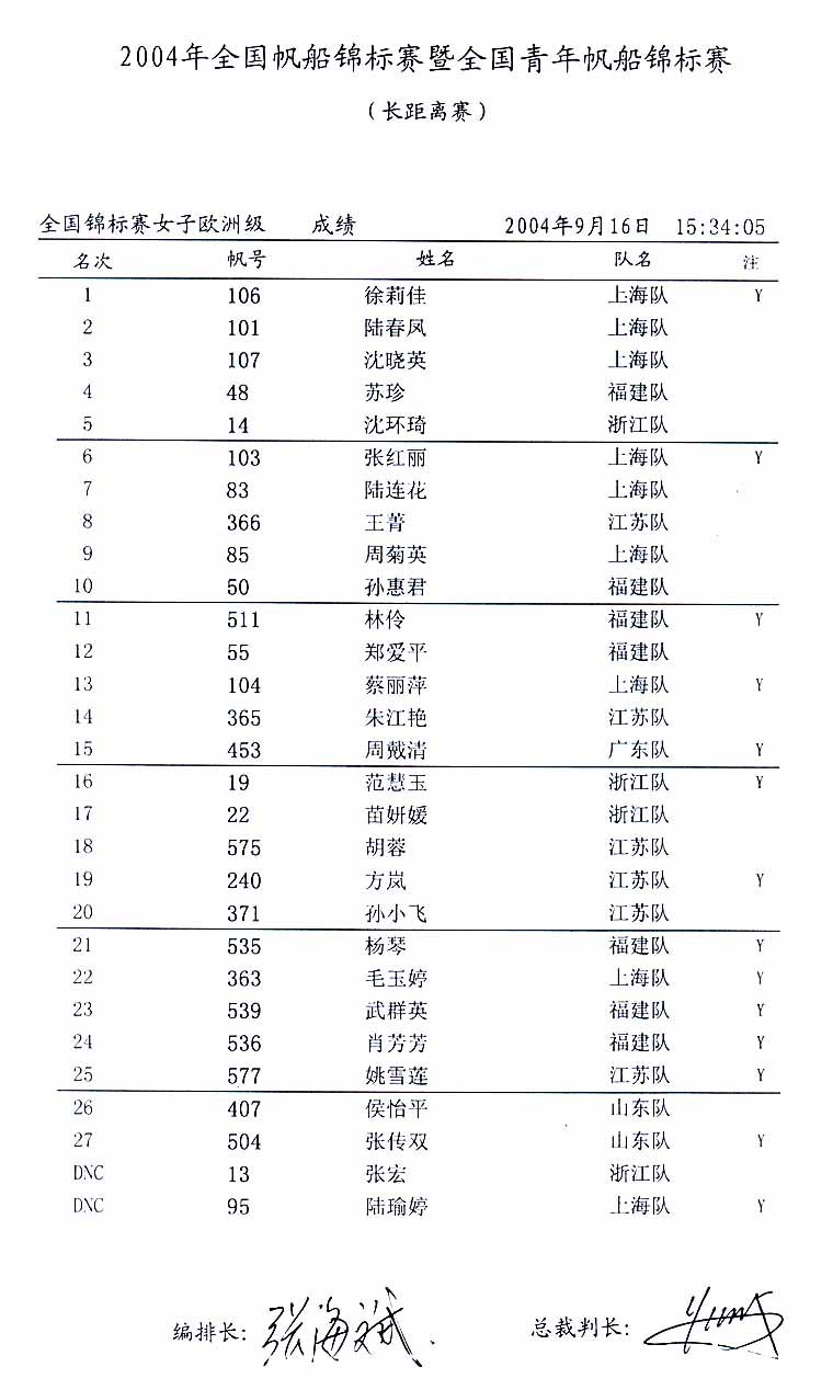 2004全国帆船锦标赛暨全国青年帆船锦标赛成绩(十)(2004年09月21日)