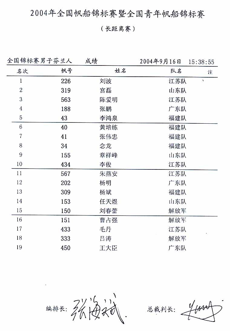 2004全国帆船锦标赛暨全国青年帆船锦标赛成绩(十三)(2004年09月21日)