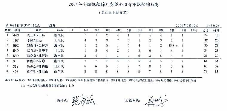 2004全国帆船锦标赛暨全国青年帆船锦标赛成绩(十五)(2004年09月21日)