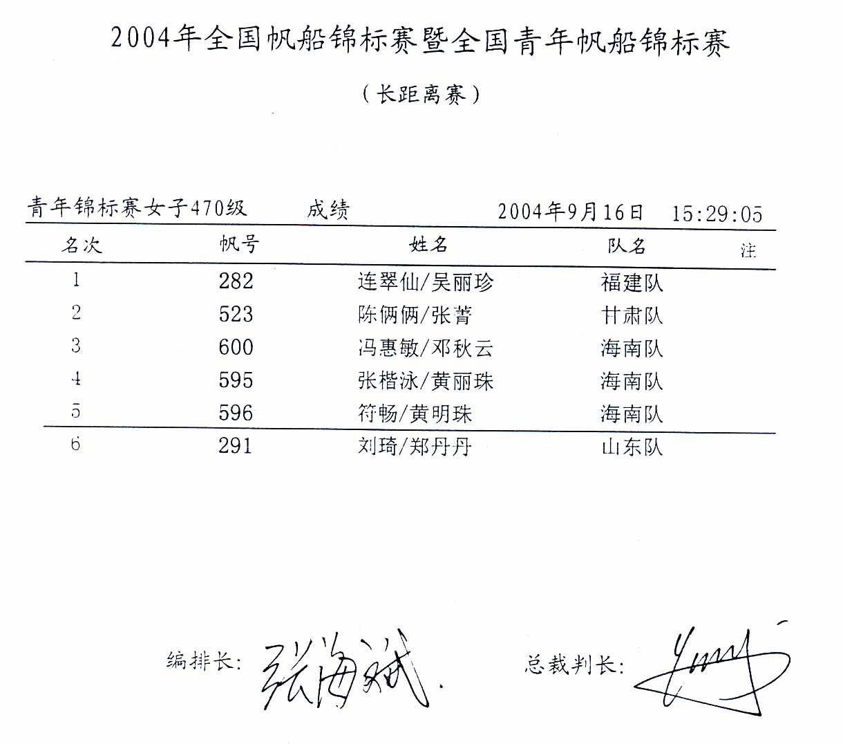 2004全国帆船锦标赛暨全国青年帆船锦标赛成绩(二十一)(2004年09月21日)