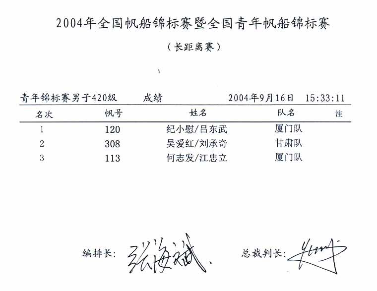 2004全国帆船锦标赛暨全国青年帆船锦标赛成绩(二十四)(2004年09月21日)
