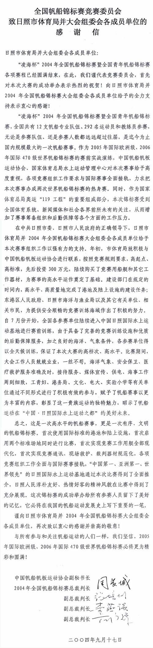 全国帆船锦标赛竞赛委员会致日照市体育局并大会组委会各成员单位的感谢信(2004年09月22日)
