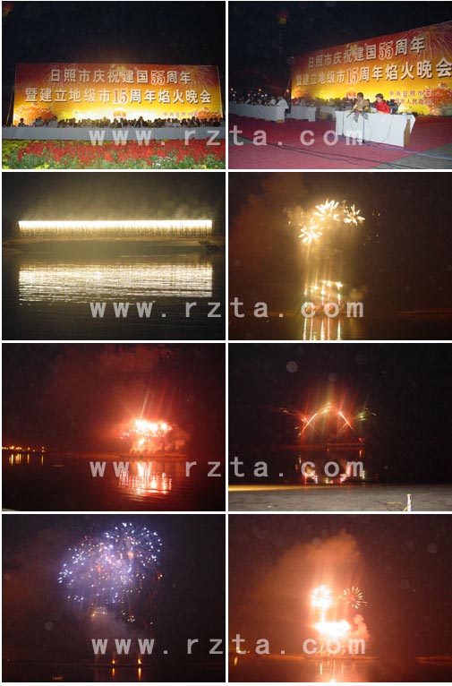 本网讯:9月26日晚8点,日照市庆祝建国55周年暨建立地级市15周年焰火晚会在万平口生态旅游公园南侧——全国第一、亚洲第一、世界领先的日照国际水上运动基地隆重举行。出席观看焰火晚会的有:市委、市人大、市政府、市政协、市纪委和日照军分区的领导同志,市级老领导、各民主党派、工商联负责人,全国人大代表、劳模代表,驻军首长和各大专院校领导。同时省政府办公厅的领导也出席观看了晚会。晚会呈现一派祥和、安定、快乐、欢庆的景象。