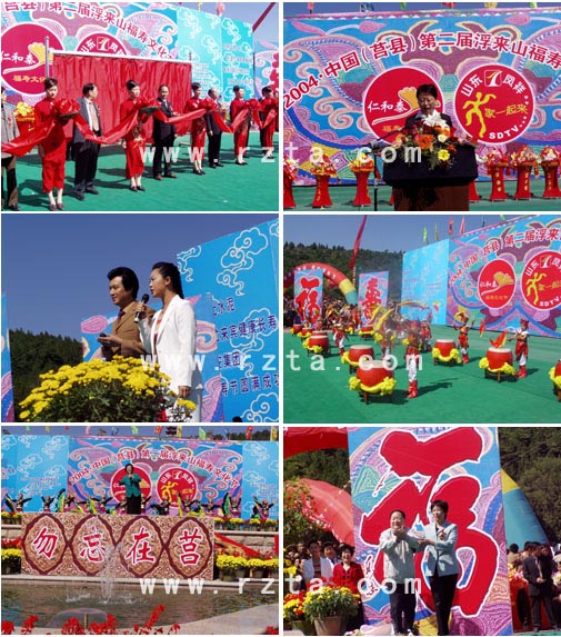 本网讯 2004年10月2日上午,一个秋风送爽、桂花飘香的日子,人们盼望已久的2004·中国(莒县)浮来山福寿文化节正式举行开幕式。出席开幕式的有:省旅游局、市委、市人大、市政府、市政协、市纪委以及莒县县委、县人大、县政协等有关领导。开幕式由国家一级演员刘小丽、邓小平的扮演者曹灿和山东电视台著名主持人李敏、曹军主持。